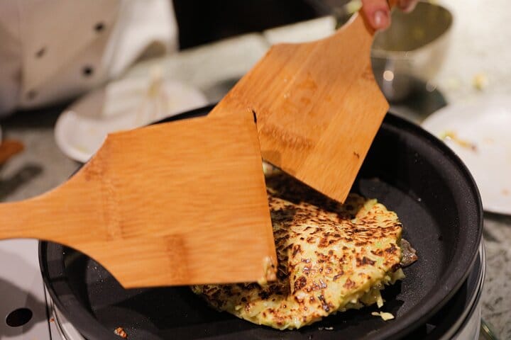Okonomiyaki is a type of Japanese pancake made with flour, eggs, cabbage, and various other ingredients such as meat, seafood, and noodles, cooked on a griddle. The batter is made by mixing flour with water, and then other ingredients like vegetables, meat, or seafood are added. It is cooked on a griddle and served with condiments like sauce, mayonnaise, and aonori (dried seaweed).